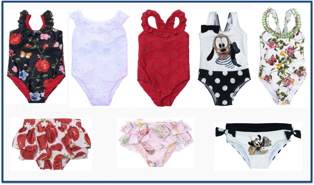 Costume intero San Gallo 109 €, bianco San Gallo 95 €, rosso San Gallo 109 €, intero Pluto 45 €, intero rose 63 €, mutandina fragole 46 €, mutandina dolcetti 66 €, mutandina Pluto 29 €